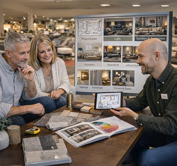 Viele Menschen haben ein gutes Bauchgefühl dafür, was ihnen gefällt – doch sobald mehrere Möbel, Farben und Materialien zusammenkommen, wirkt es schnell unruhig oder beliebig. Genau hier unterstützt Möbel Waeber: Wir übersetzen Ihre Vorlieben in eine klare Stilrichtung und zeigen, wie Sie diese konsequent umsetzen. Das Ziel ist nicht ein „Trend-Look“, sondern ein roter Faden, der sich durch den ganzen Raum zieht: Formen, Materialien, Farben, Licht und Textilien greifen ineinander, ohne dass es streng oder steril wirkt. So entsteht ein Zuhause, das authentisch wirkt – und langfristig passt.