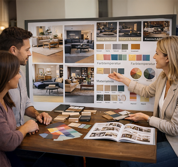 Ein Wohnstil ist mehr als einzelne Lieblingsstücke. Entscheidend ist, welche Gestaltungselemente sich wiederholen: Linien (geradlinig vs. organisch), Oberflächen (matt, natürlich, glänzend), Materialmix (Holz, Metall, Stein, Glas), Farbtemperatur (warm/kühl) und das Verhältnis von Ruhe zu Akzenten. In der Beratung klären wir, welche Wirkung Sie suchen: eher modern und reduziert, eher wohnlich und natürlich, eher klassisch und elegant oder eher kreativ und kontrastreich. Oft zeigt sich dabei, dass es nicht „nur ein Stil“ ist, sondern eine Hauptlinie mit bewusst gesetzten Ergänzungen – damit Ihr Zuhause persönlich bleibt, aber nicht zusammengewürfelt wirkt.