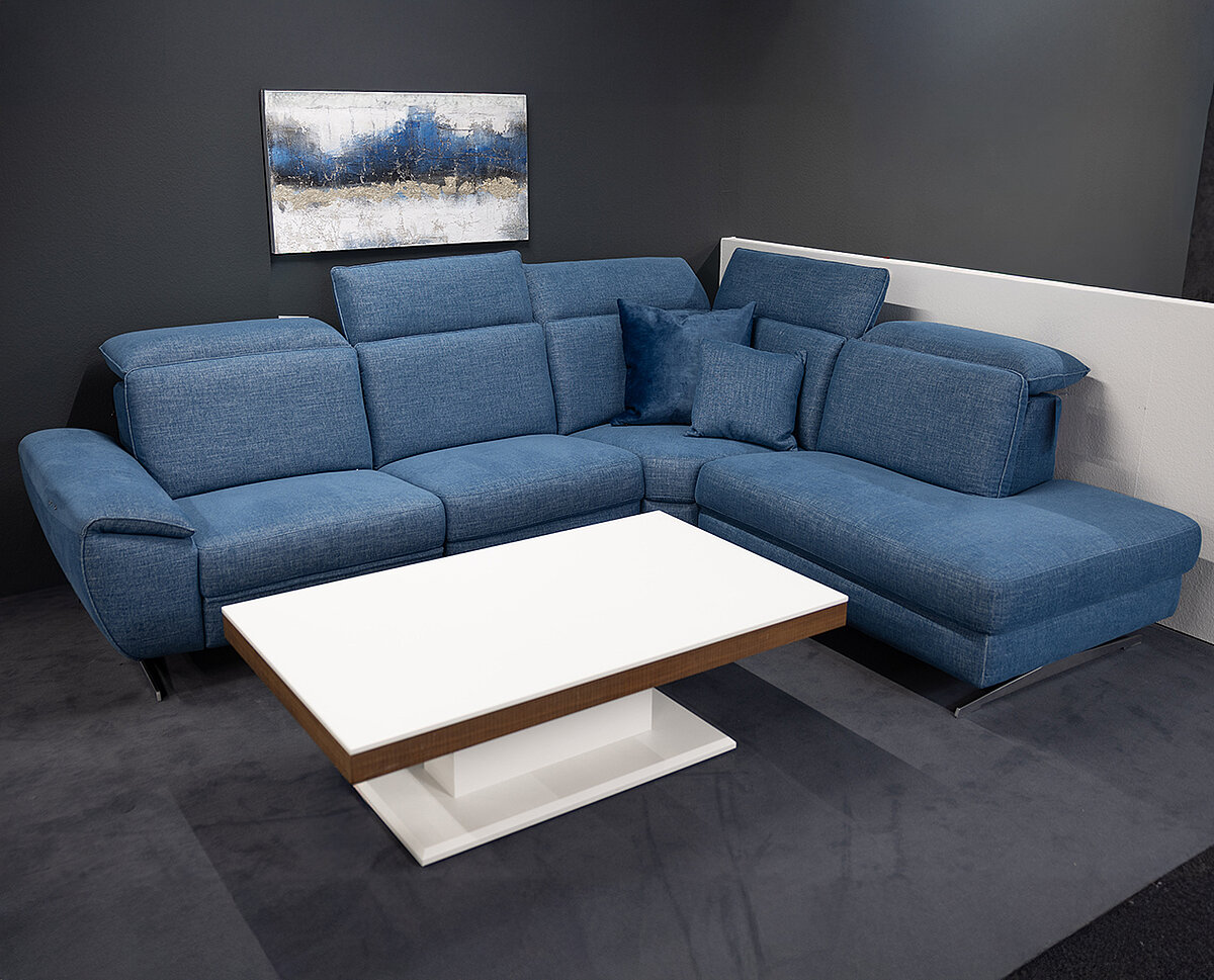 Die Eckgruppe bietet grosszügig Platz zum Sitzen und Liegen und wirkt durch den kühlen Blauton modern, aber dennoch wohnlich. Die weich gepolsterten Armlehnen unterstützen eine entspannte Sitzposition. Die Kopfstützen sind einzeln verstellbar und erlauben dadurch eine angenehme Rücken- und Nackenunterstützung auch bei längerem Sitzen.