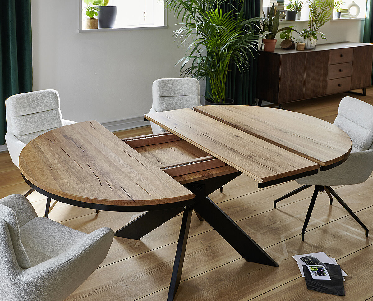 Der Esstisch NOTTINGHAM verbindet massives Eichenholz mit einem stabilen, schwarz lackierten Metallfuss und wirkt dadurch modern und wertig. Die runde Tischplatte aus 2.5 cm starker, rustikal geölter Eiche hat im Grundmass 120 cm Durchmesser und lässt sich mit der passenden Einlegeplatte auf 160 cm erweitern – ideal, wenn mehr Gäste am Tisch sitzen sollen. Die Auszugsfunktion ist sauber integriert und lässt sich schnell öffnen, ohne dass zusätzliche Gestelle im Weg sind