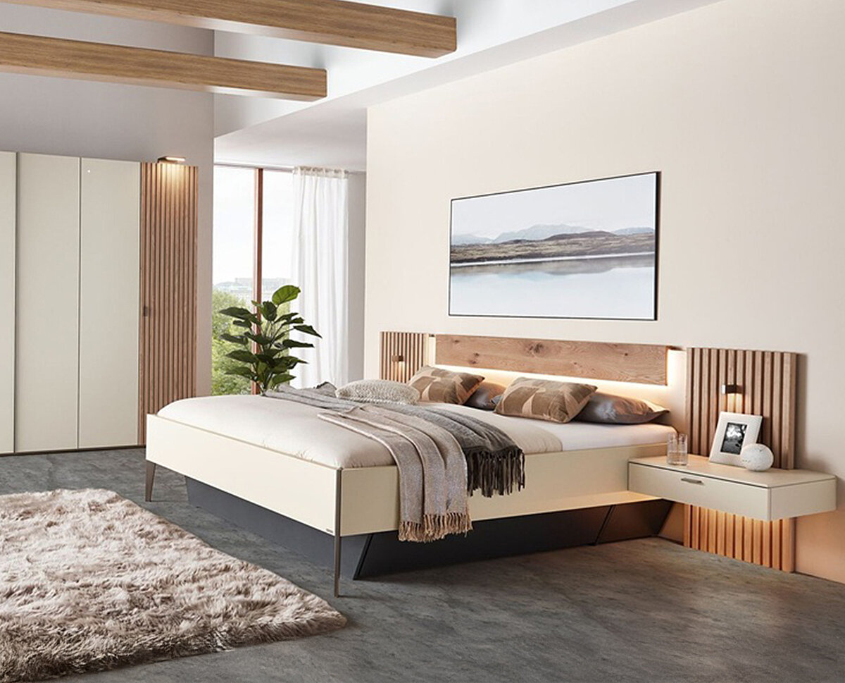 Elegantes Bett in Lack Champagner mit warmen Akzenten in Wildeiche-Lamellen – modern inszeniert auf einem Untergestell mit metallteilen in Titanfarben. Die Liegefläche 180 × 200 cm bietet komfortablen Platz für zwei Personen und wirkt dank der klaren Linien ruhig und wertig. Optional erhältlich: Beleuchtung sowie Nachttische mit Paneel (rechts oder links) – passend zum Programm.